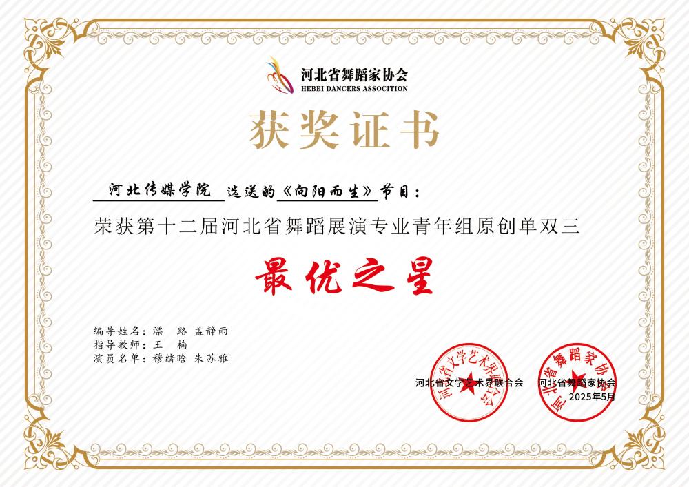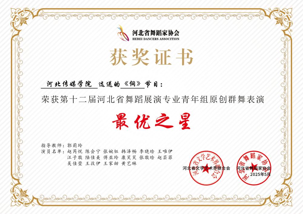 作为河北省舞蹈领域极具影响力的专业赛事,第十二届河北省舞蹈展演汇聚了全省各地优秀的舞蹈团体与艺术人才,竞争异常激烈,舞蹈艺术学院在多个组别中实现奖项丰收。专业青年组课堂荣获最佳之星;学演单双三作品收获最优之星2项、最佳之星2项、精彩之星1项;学演群舞作品收获最优之星与最佳之星两项荣誉。原创作品板块同样硕果累累,其中原创单双三作品收获最优之星2项、最佳之星2项;原创群舞创作荣获最佳之星4项、精彩之星4项;原创群舞表演荣获最优之星1项、最佳之星3项、精彩之星4项。此外,专业少年组的学子们也不负众望,学演群舞作品荣获最优之星1项、精彩之星2项;学演单双三作品拿下最优之星3项、精彩之星2项,展现了学院在舞蹈人才培养方面的扎实基础。