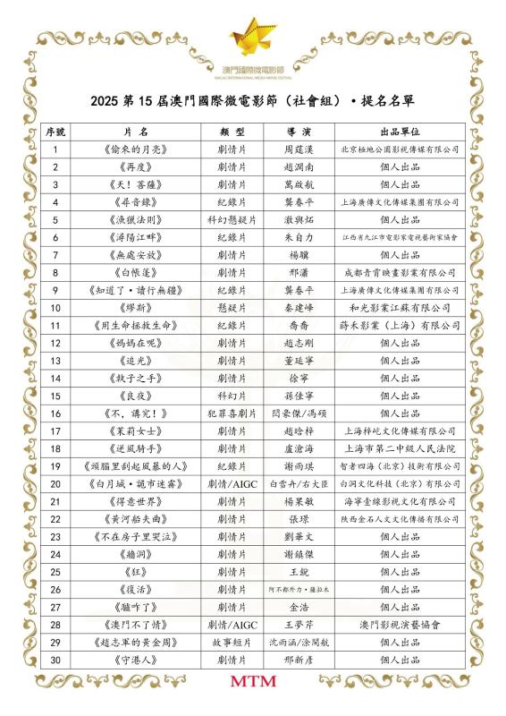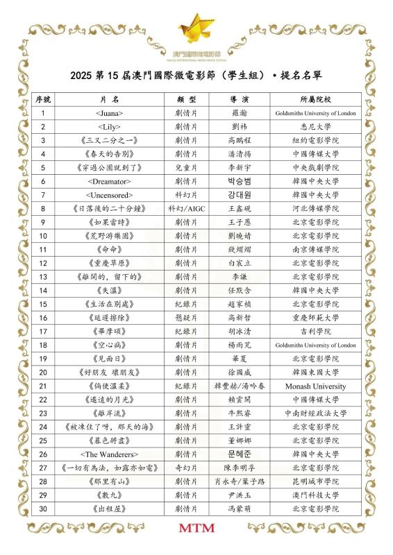 近日,第15届澳门国际微电影节提名名单正式揭晓,由河北传媒学院姚婉莉编剧、徐宁执导的短片《执子之手》获“社会组”提名,由白倩雨指导、2021级戏剧影视文学专业王鑫砚导演的短片《日落后的二十分钟》荣膺学生组提名。