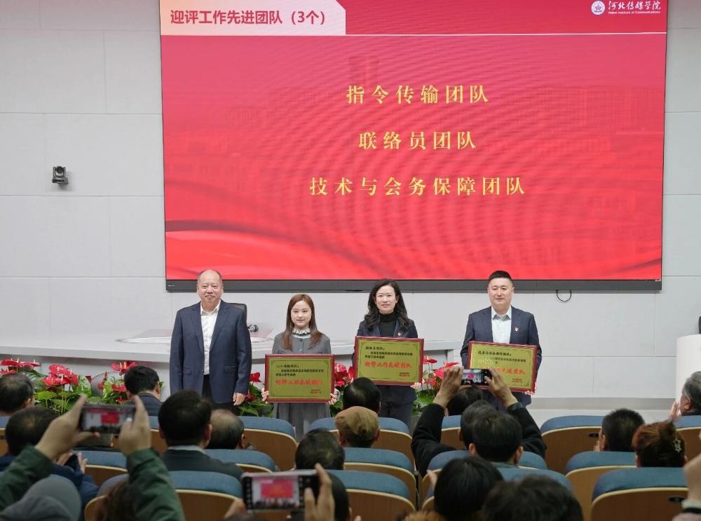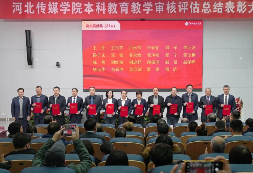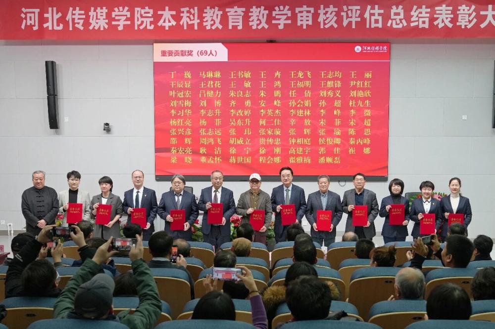 政府督导专员贺海宏宣读了《河北传媒学院关于表彰本科教育教学审核评估工作中先进单位、先进个人的决定》,在热烈的掌声和激昂的旋律中,获得“爱岗敬业模范奖”“教学工作优秀奖”“管理工作优秀奖”“服务工作优秀奖”“重要贡献奖”“突出贡献奖”的先进个人代表及“迎评工作先进团队奖”“评建工作先进集体奖(处室)”“评建工作先进集体奖(学院)”的先进单位代表依次走上领奖台,接受学校及集团领导颁发的奖牌和荣誉证书。新闻传播学院院长张金桐、教务处处长卢永芳作为先进单位代表饱含深情地分别作了发言,分享了几年来积极参与评建工作的切身体会与辛勤收获,表达了对学校未来发展的坚定信心和再接再厉、再立新功的坚强决心。