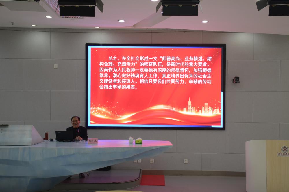 讲座中,朱月龙教授通过政策解读的方式,深入讲解《新时代高校教师职业行为十项准则》等核心政策文件,明确师德师风在教师队伍建设中的核心地位,强调师德考核“一票否决”、师德失范“零容忍”的刚性要求,帮助新教师清晰把握职业行为底线与红线。同时结合近年来高校师德失范典型案例,深入剖析教师在学术诚信、师生交往、职业行为等方面的突出问题,以案为鉴、以案明纪,警示新教师坚守教育初心、恪守职业操守,自觉维护教师职业形象。最后,深挖中华优秀传统文化中的“师道”精神,阐释师德师风的内涵、要义等核心内容,解读“以德立身、以德立学、以德施教”的深刻内涵,引导新教师以“四有”好老师为标准,争做“四个引路人”,将教书育人和自我修养有机融合。朱月龙教授的讲座条理清晰、案例丰富、剖析深刻,为全体参训教师带来了一堂兼具思想性与指导性的师德师风教育课。