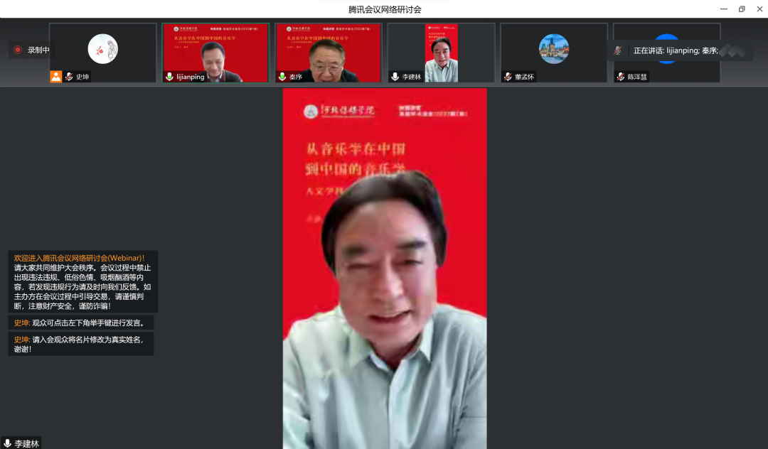 2022年12月16日,我校利用腾讯平台在线举办了2022年第7期“传媒讲堂”高端学术报告,中国艺术研究院音乐研究所秦序教授应邀作了《从音乐学在中国到中国的音乐学——人文学科有民族有祖国》的专题报告。李锦云校长出席会议并致辞。全体校领导、全体中层干部及专业建设负责人和研究生导师等170余人听取报告,河北传媒学院音乐学院院长李建林分享了自己的体会和感受。李建平副校长主持报告会。