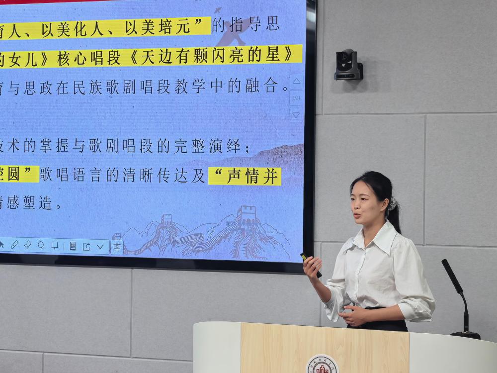 参赛教师根据现场抽签顺序,结合美育课程的教学设计,依次进行说课与教学展示。专家评委从教学目标、教学内容设计与学情分析、课程思政、教学方法与过程、教学评价、教师素养与创新特色等多个维度进行了全面评分。
