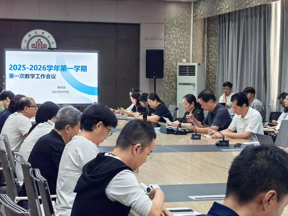 9月9日,河北传媒学院2025-2026学年第一学期第一次教学工作会议在兴安校区召开。常务副校长王锡朝、副校长李兴国、校长助理韩景元出席会议。教务部科级以上人员、各二级学院院长、主管教学副院长、教学秘书、直属教研室主任、信息管理中心主任参加会议。会议由教务处处长卢永芳主持。